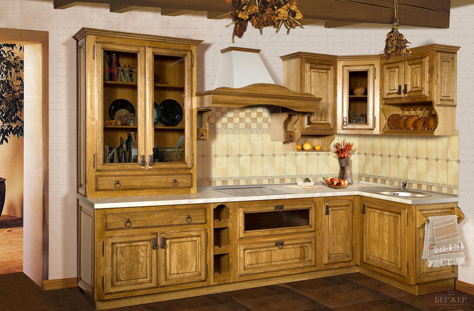 Коллекция «Марсель». Кухня выполнена из массива дуба. Размеры образца на фото (ШхВхГ), мм: 3150×2265×1200.